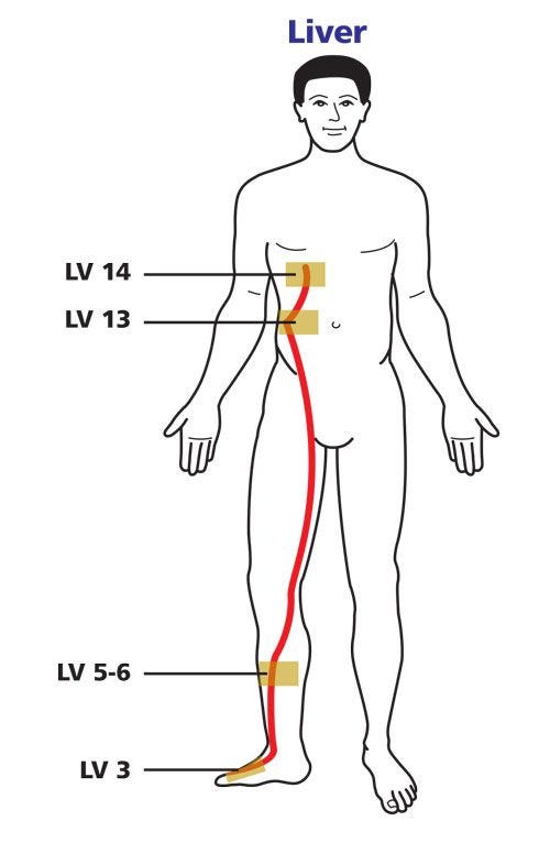 The Liver meridian begins at the lateral side of the big toe; the side closest to your pinky toe. It runs up the top of the foot, to the medial (inner) aspect of the leg through the groin, around the genital area, the stomach and the physical Liver area (upper right portion of abdomen), then over to the intercostal (rib) area.